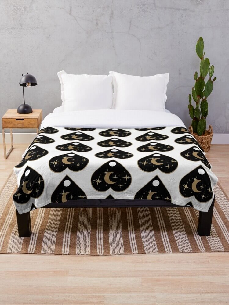 Turn your bed or sofa into a witchy sanctuary with the Golden Planchette Ouija Throw Blanket. This design features a repeating pattern of black planchettes edged in warm gold, each one cradling a crescent moon and tiny sparkling stars. It’s the perfect blend of occult aesthetic and minimalist glam, so it works just as beautifully in a neutral living room as it does in a full-on magical lair.