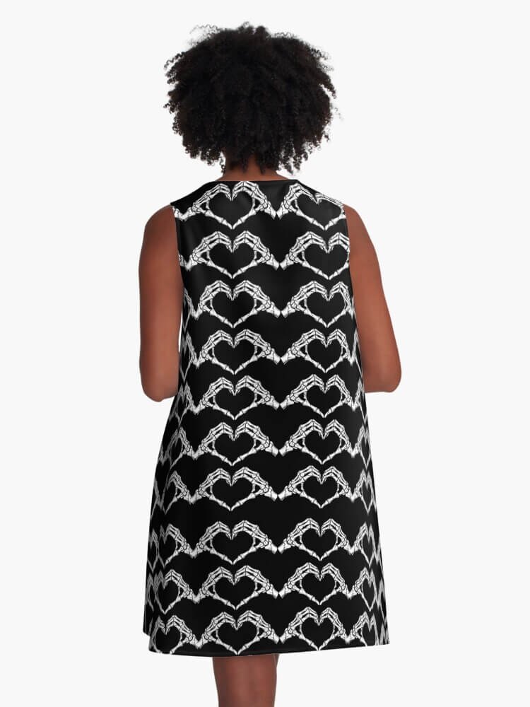 The A-line silhouette is flattering and easy to wear, with a relaxed fit that skims the body without clinging. It moves beautifully when you walk, giving the repeating skeleton heart pattern a dreamy, almost hypnotic effect. Dress it up with heels, a leather jacket and layered jewelry for a night out, or keep it casual with boots or sneakers and a cozy cardigan. However you style it, the dress makes it clear: your heart belongs to the spooky side.