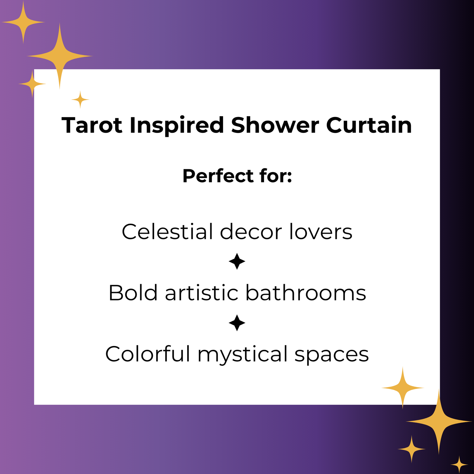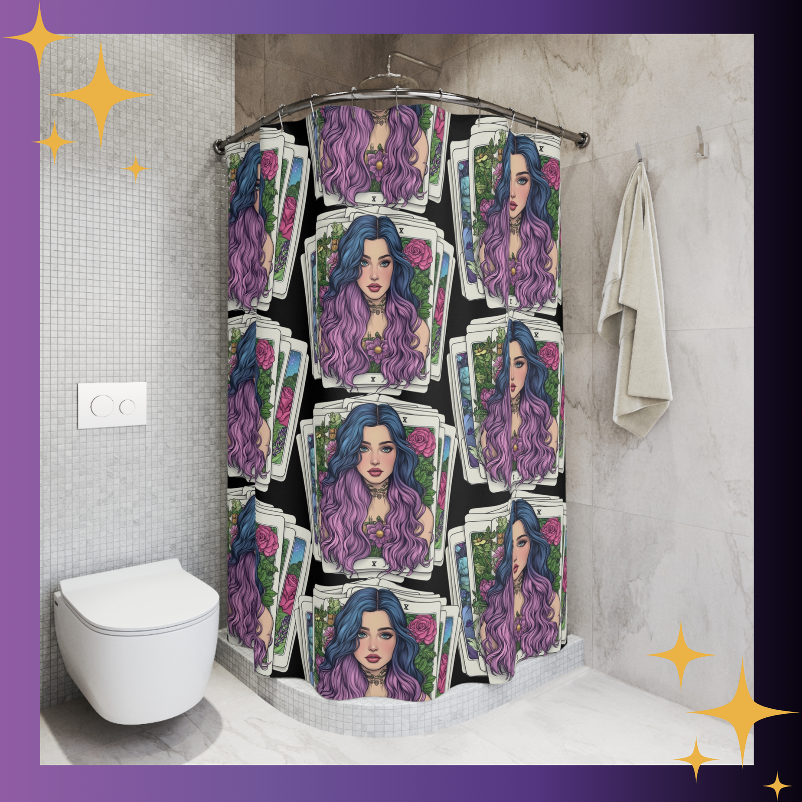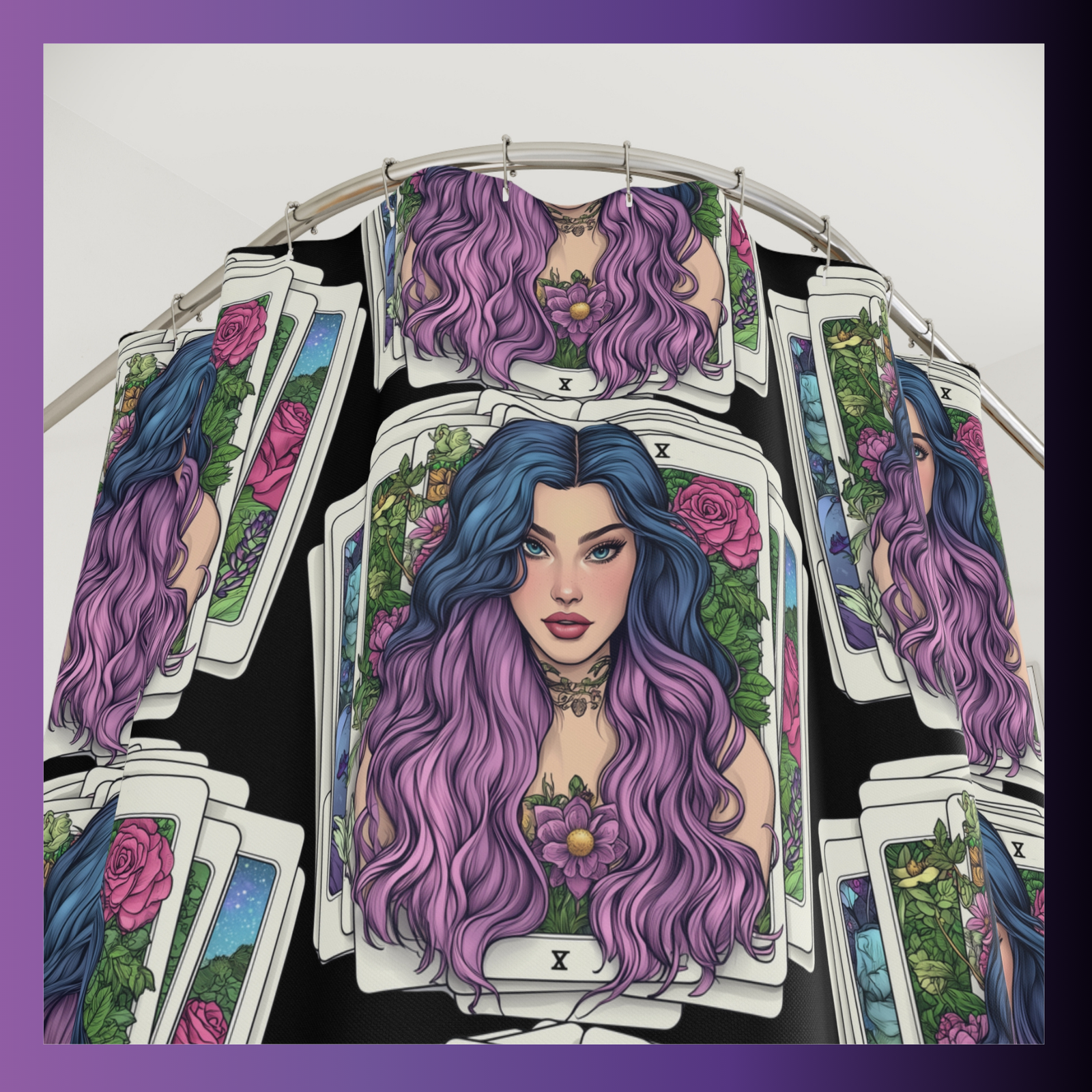 Transform your space with the Tarot Empress shower curtain from Mystical Hue Realm. This shower curtain brings a bold, mystical energy into your bathroom. Illustrated like a repeating tarot card, the central figure — a woman with flowing blue-to-violet hair and a rose-accented frame — creates a moody, artful backdrop that feels both modern and witchy.